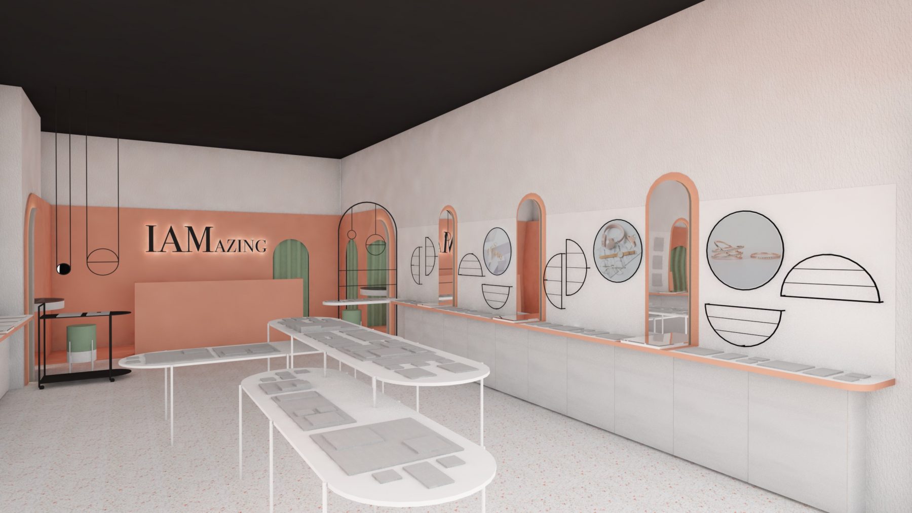 The jewellery brand “IAMazing” wanted a new look for the new store in the renowned shopping centre Tivoli in Spreitenbach near Zürich. The new concept should mostly be aiming young women and sells mostly gold and silver platted jewellery and also some expensive jewellery with pure gold and diamonds. The clients brief was to change the layout of the store to feel welcoming to the customers, inviting them into the store and feel warm, friendly and modern, the store layout should allow the maximum surface to expose jewellery on walls and tables.